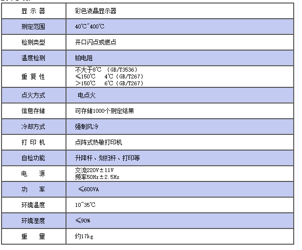 KLK301開口閃點(diǎn)自動(dòng)測(cè)定儀是采用ARM微處理器技術(shù)設(shè)計(jì)的一款新型閃點(diǎn)自動(dòng)測(cè)定儀。該儀器采用大屏幕彩色液晶顯示,中文菜單觸摸屏控制,完全電點(diǎn)火方式。具有自動(dòng)升溫,自動(dòng)劃掃,自動(dòng)點(diǎn)火,標(biāo)準(zhǔn)程序適時(shí)選擇,溫度自動(dòng)跟蹤顯示,自動(dòng)鎖定閃點(diǎn)值并自動(dòng)打印結(jié)果,大氣壓校正和強(qiáng)制風(fēng)冷功能。 該儀器結(jié)構(gòu)合理、操作簡(jiǎn)單,測(cè)定結(jié)果穩(wěn)定可靠是開口閃點(diǎn)測(cè)定的理想儀器,儀器廣泛運(yùn)用于電力、石油、化工、科研等部門。 符合標(biāo)準(zhǔn)GB/T3536-2008、GB/T267-88。 技術(shù)參數(shù):