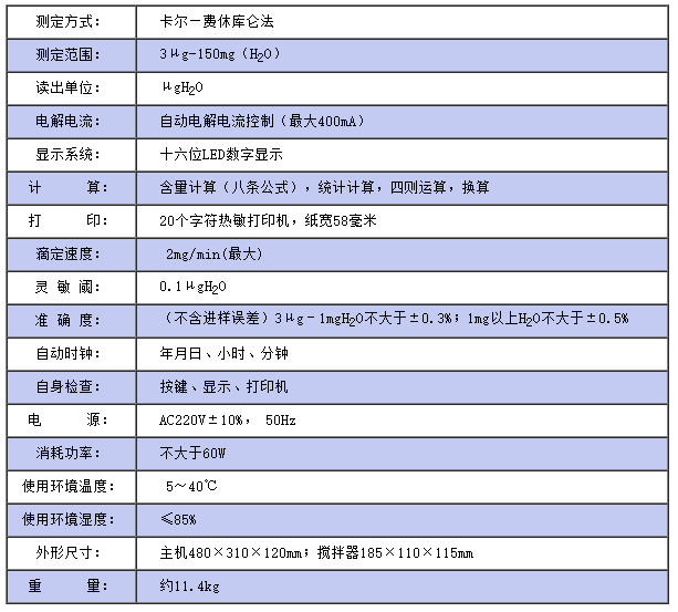 儀器符合GB/T7600;SH/T0246;GB/T606及采用卡爾—費(fèi)休法測定樣品中水分的有關(guān)標(biāo)準(zhǔn)。 儀器采用了先進(jìn)的自動(dòng)控制電路,電解電流自動(dòng)跟蹤控制,外型結(jié)構(gòu)新穎,從而使該儀器工作更可靠,使用更方便,具有分析速度快(一分鐘出結(jié)果)、操作簡便、精度高、自動(dòng)性強(qiáng)等特點(diǎn),同時(shí)具有自動(dòng)打印功能,可將實(shí)驗(yàn)結(jié)果、做樣時(shí)間、樣品編號(hào)自動(dòng)打印出來,廣泛應(yīng)用于石油、化工、電力、鐵路、環(huán)保等部門。